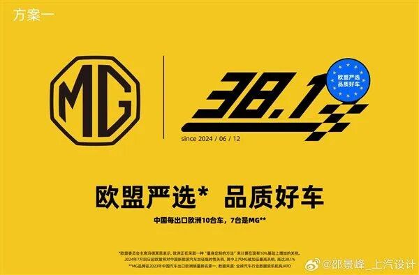 6月19日,针对可能被加征38.1%的税率,上汽集团技术中心副总设计师兼全球设计总监邵景峰在微博发文称,“应网友要求,MG 38.1两个Logo都做了设计周边。”