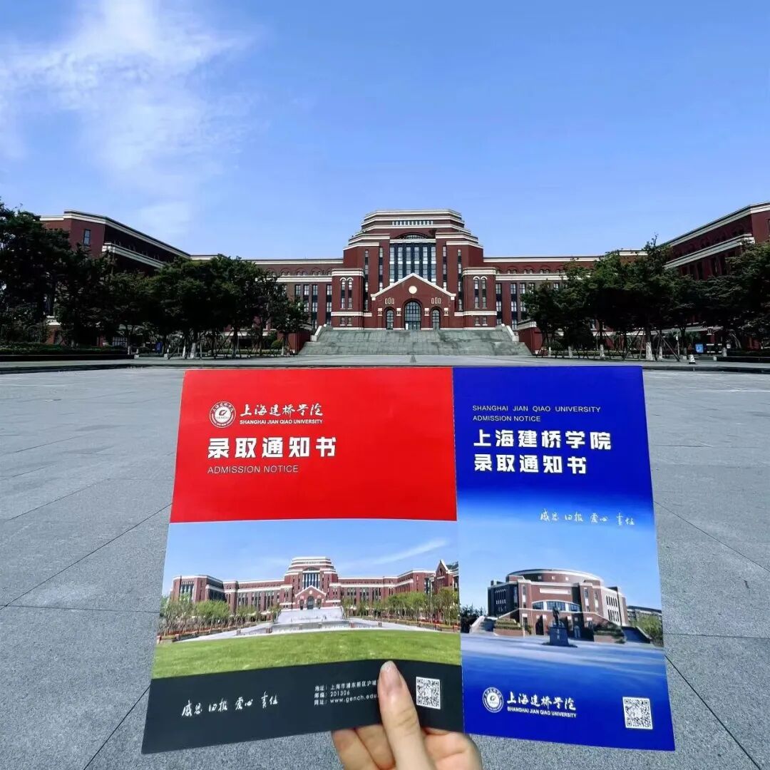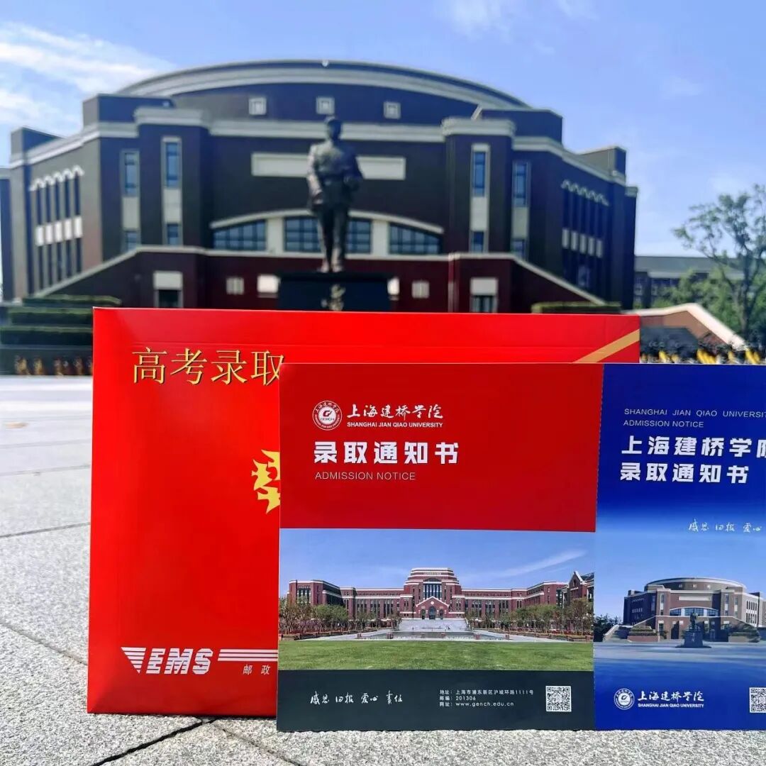 上海建桥学院录取通知书采用建桥红与建桥蓝为主色调,同时加入了校名、校徽、校训等元素,沉稳大气。通知书正面印有学校标志性建筑:开启知识财富之门的图书馆与永远矗立的精神标杆雷锋像。录取通知书左右两联可以分开,学生可保留副本用于永久珍藏。此外,录取通知书还采用了多项防伪技术,如纸张采用水印防伪,录取通知书的边框由学校英文缩写 SJQU 和校徽标识构成,期待与2024级新生在金秋九月相遇。