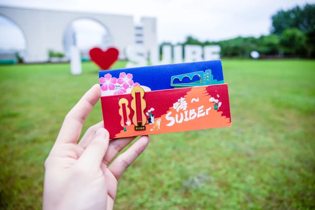 2024年录取通知书礼包整体定制成蓝红撞色毛毡包,新潮且学院感十足,一声“嗨~SUIBEr”,亲切、欣喜又充满热情。背面还有红色固定带“I 💗SUIBE”,可固定在行李箱上,方便携带。礼包内2枚定制金属书签,以校园标志性建筑为基础,与立式折卡相映成趣,描绘了校园春意盎然和爽朗金秋的别致景色,设计灵感来自“上经贸大第二届本科新生礼物设计大赛”中获奖学生作品,学长学姐们用特有的方式表达了对萌新们的欢迎。今年校长将以电子书的形式继续向每一位新生赠书,书名待萌新们自己来揭晓啦!另外,还有小小惊喜藏在新生礼包内,这里先卖个关子噢!