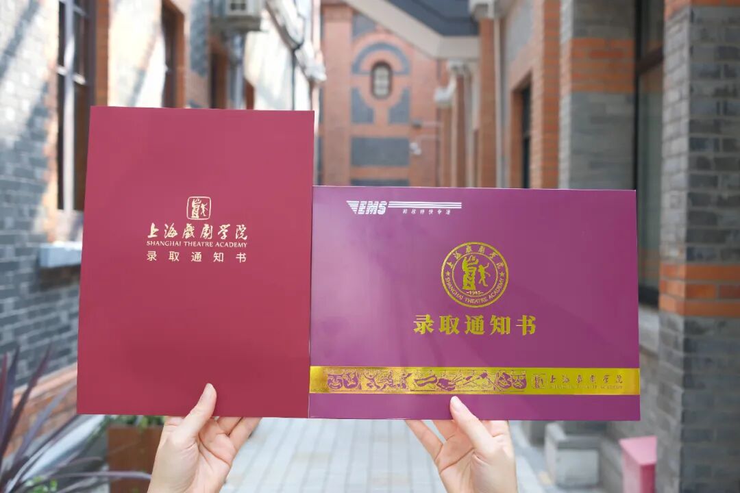 2024版上海戏剧学院高考录取通知书封套,以明代方以智所著《通雅》中记载的“北紫色”为底色,象征高贵端庄。1956年,在校名几经变更后,上海戏剧学院正式确定了此名并沿用至今。考虑到这一因素,EMS信封以及录取通知书底部图案选自1957年首次以上海戏剧学院名义举行的毕业公演海报上的通用纹底,其戏剧元素丰富多样,意象隽永,寓意由过往向未来的新篇章就此开启。
