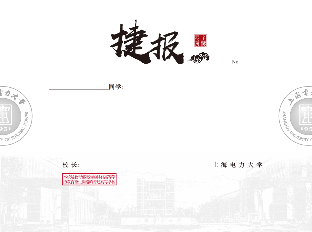 上海电力大学2024年本科生录取通知书以金色和红色为主色调,传递着喜悦与自豪;学校校徽印证在通知书上,“爱国、勤学、务实、奋进”的大学校训,素雅清丽的色彩下,背景为临港校区的校园标志性建筑,气势恢宏。捷报踏着祥云,好运乘着清风,祝愿上电的新生们鹏程万里!