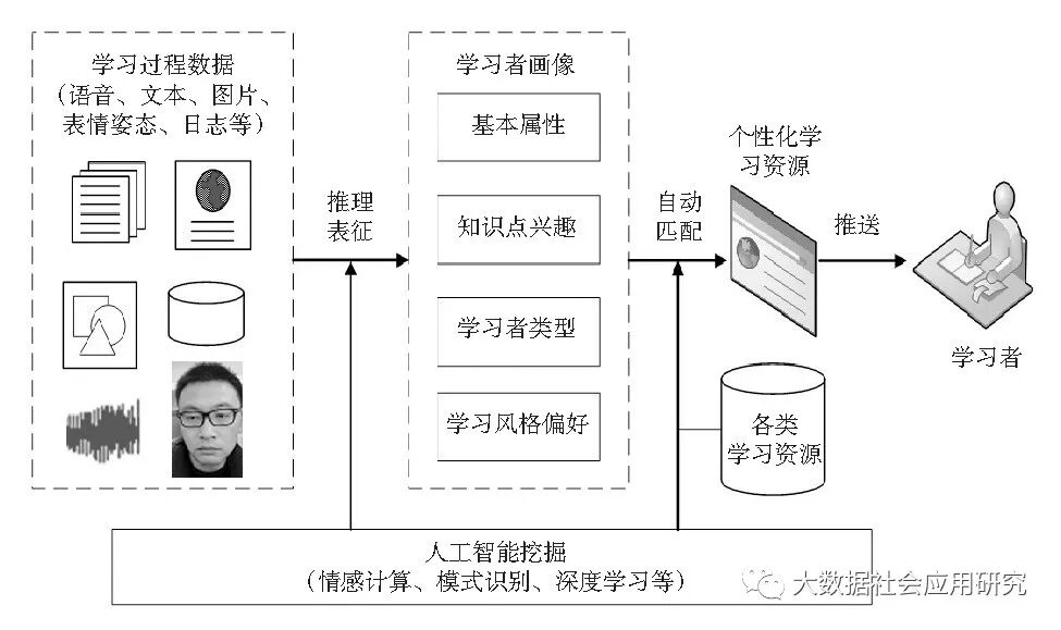 个性化教学资源建设是个性化教学的重要组成部分。个性化教学实施的前提是对学习者进行建模和知识表征,这就需要对学习者的认知水平、兴趣爱好和学习能力进行精准描绘。在人工智能技术发展成熟以前,上述内容的提取和建模不太理想,因而个性化学习资源和个性化学习方案一直难以真正实现。随着物联网、云计算、大数据分析技术的不断成熟,基于上述智能技术进行的学习者行为精准数据挖掘为个性化教学资源建设提供了关键技术支撑。